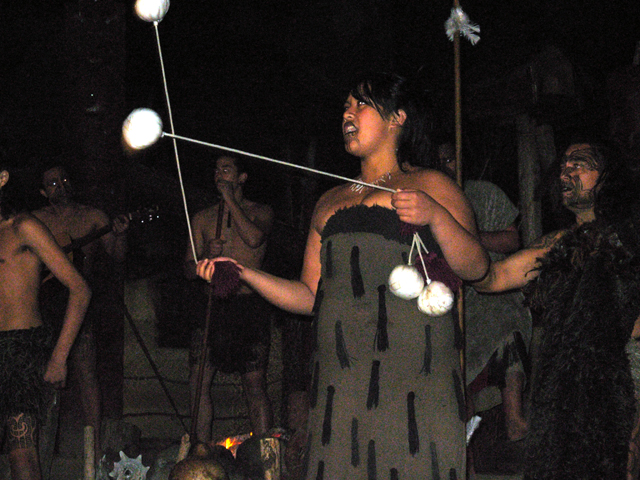We walked down to the creek to watch the warriors paddle their canoe into the village. After that, there was the main performance. They danced and sang songs in their native tongue. They demostrated traditional weapons and games. Dinner was served buffet style and was very tasty. To top the evening off, we all received flashlights to go for a walk in the woods. We viewed glowworms and the village's sacred spring.